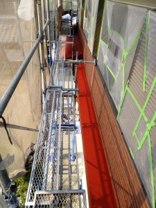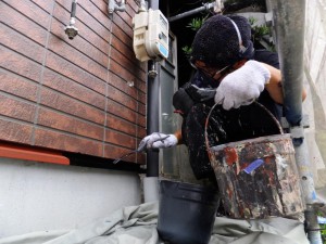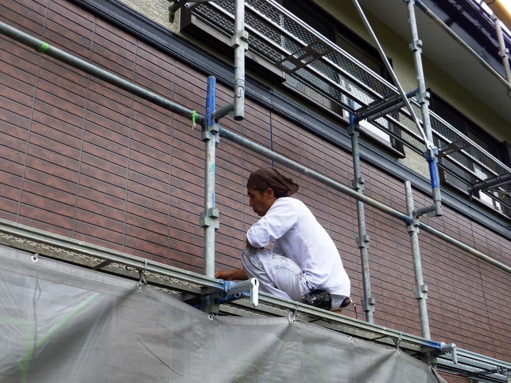 この現場では今、金属部分の下塗りを行っています。