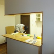 新しいキッチンもカウンター付きをご希望されましたが、壁を薄くし、その分カウンター幅を稼ぐ手法を取りました。