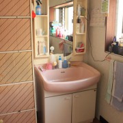 洗面化粧台も新しくなりました。洗面室のクロスも貼り替えて、一新しました。