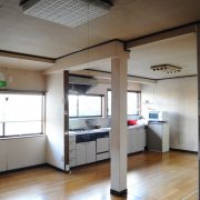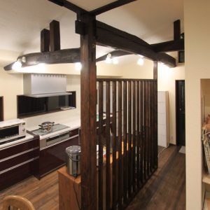 天井を貼って低かったキッチンを間仕切りを減らし吹抜天井の古い梁を見せることによる開放感を演出する。