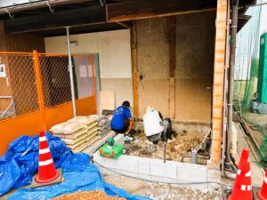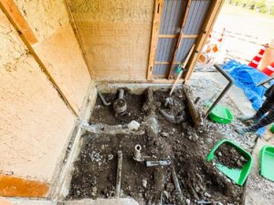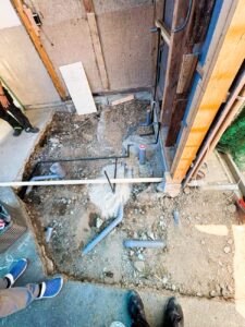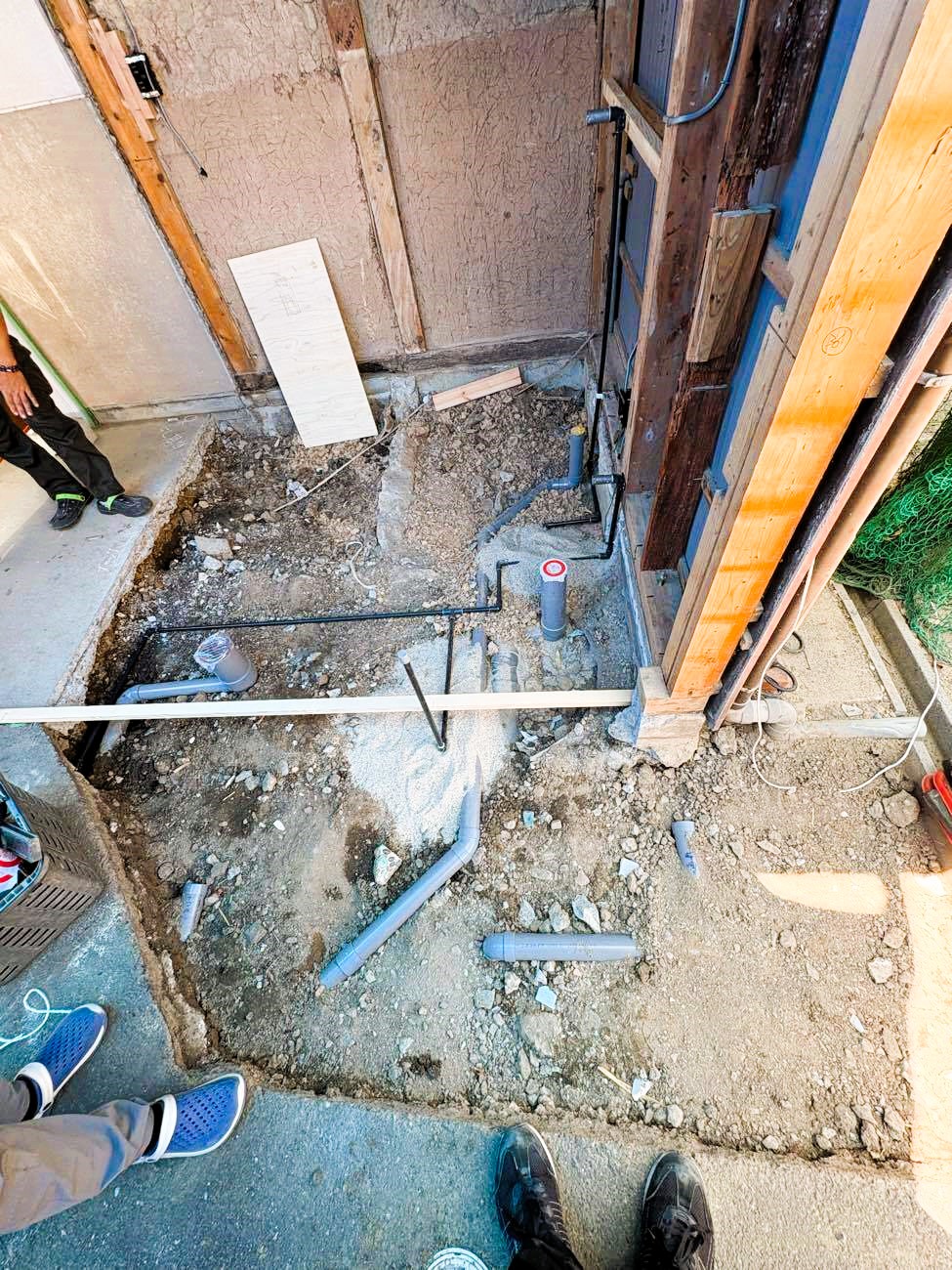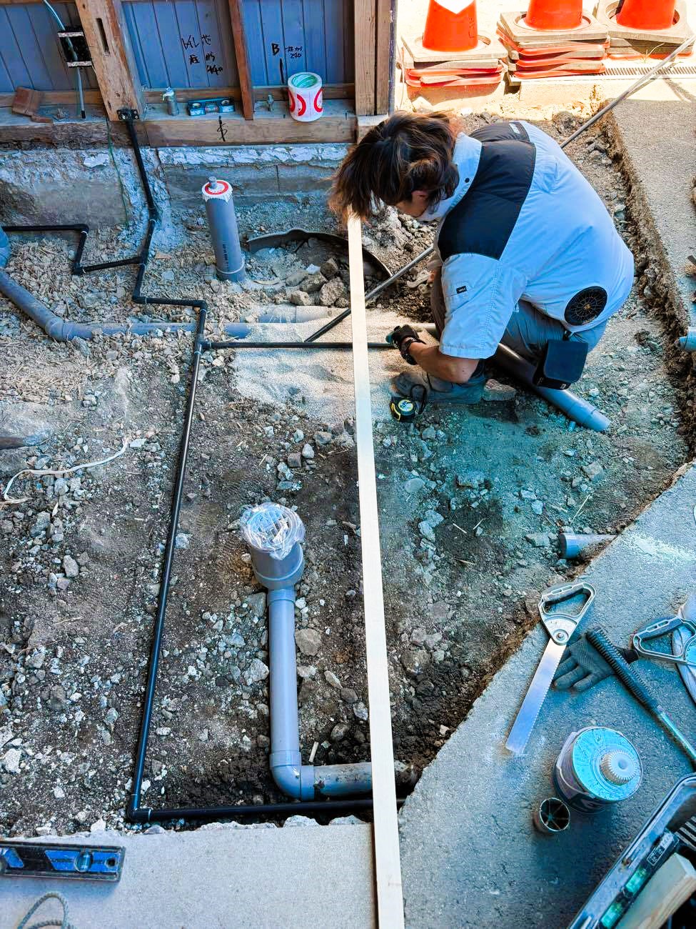 内部と外部の仕上がりから、位置出しをして先行して給排水の配管工事を行います。