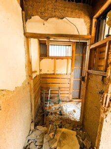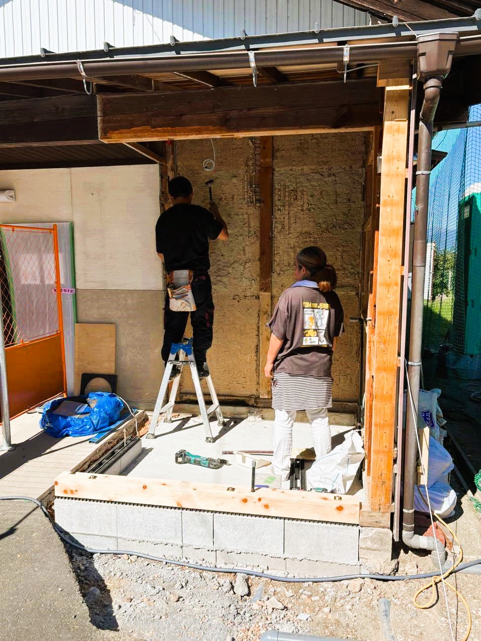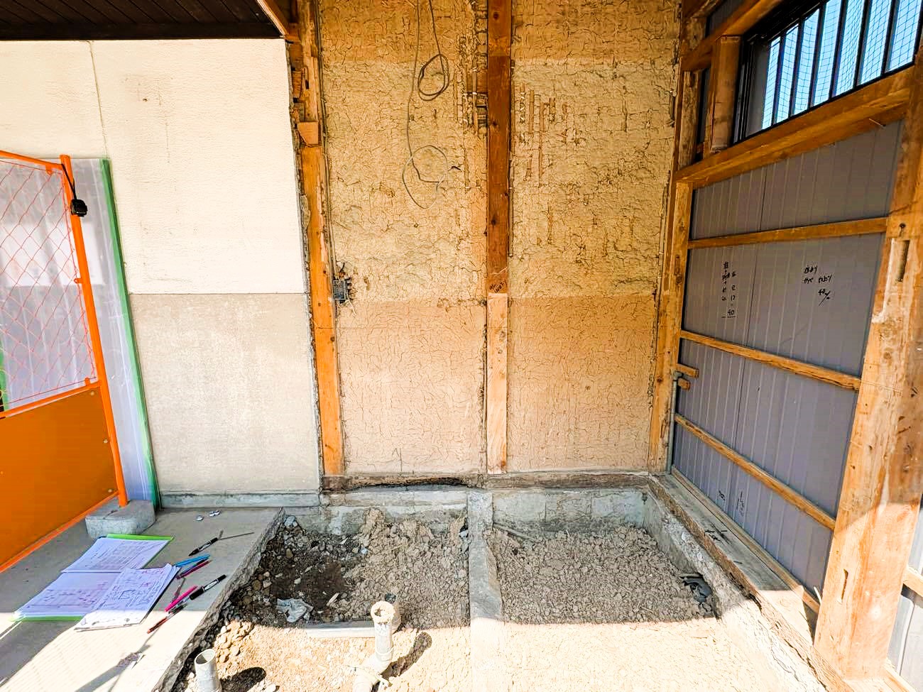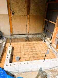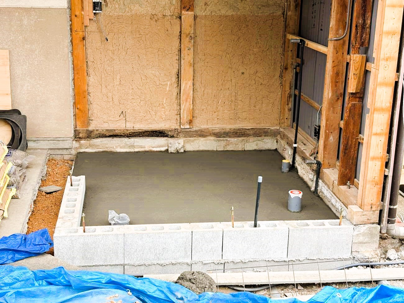 内部と外部の仕上がりから、位置出しをして先行して給排水の配管工事を行います。